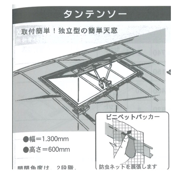 開閉角度は2段階あり、最大250mmまで開口できます。また、付属のタンテンソーカバー(アルミ)が雨の侵入を防ぎます。