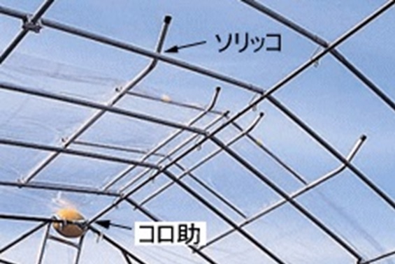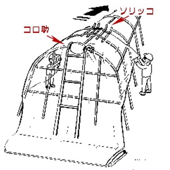 ハウスのビニール張りに棟部での繰り出しを楽にするコロ助(重量4kg)と嶺を滑るソリッコ(重量2.5kg)とのセット。妻面からのシート張りが二人作業で簡単にできる。ハウスの高さ4mまで対応。