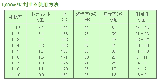 レディソルの遮光効果は必要に応じ調整できます。希釈濃度を変えることで、例えば、遮光被膜を春には薄く、夏には厚くすることが出来ます。