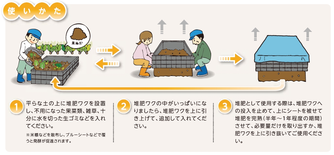 堆肥作りに力を発揮。ポリエチレン製の板をボルト、ナットで固定して利用。