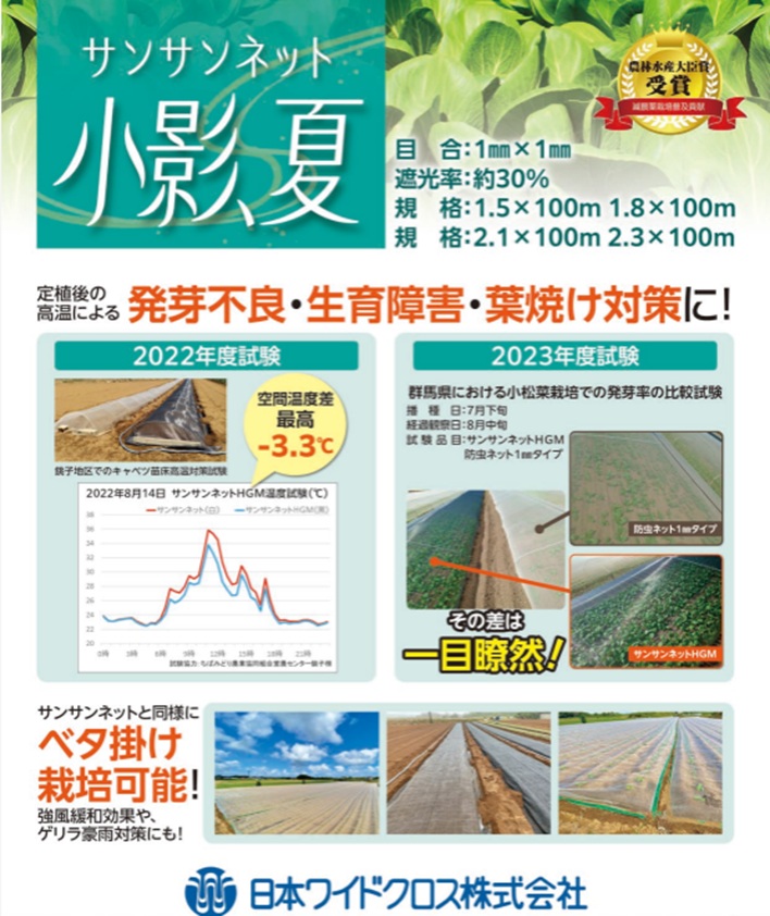 「サンサンネット小影、夏」は、強い日差しや高温から作物をやさしく守る夏季向け遮光ネットです。 約30%の適度な遮光率が、発芽不良や葉焼けを防ぎつつ、光合成に必要な光をしっかり確保します。 目合い1mmの細かな編み目がゲリラ豪雨や強風の衝撃を緩和し、トンネル栽培からベタ掛け栽培まで幅広く使用可能です。 軽量で扱いやすく、設置・撤去も簡単なので、家庭菜園からプロ農家まで幅広くご活用いただけます。