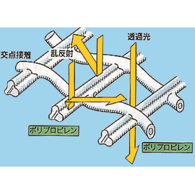 ポリプロピレンの糸を交点接着してあるため目ズレが無く、ホツレにくい。特殊形状の糸が光を乱反射し防虫忌避効果アップ。耐久性、対候性、耐農薬性にすぐれる。