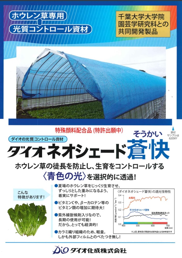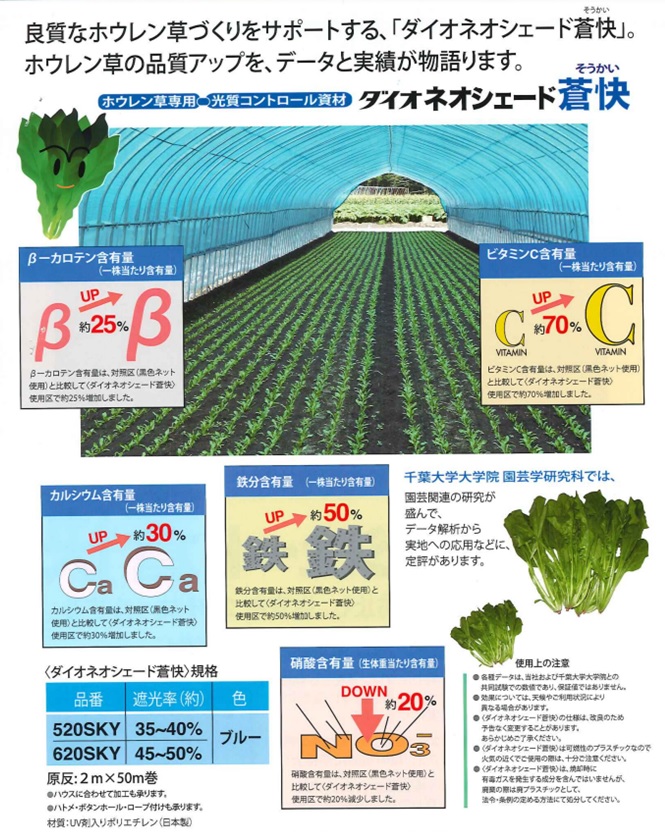 ほうれん草栽培に有用な特定の光線領域を多く取り込む機能を有しています。