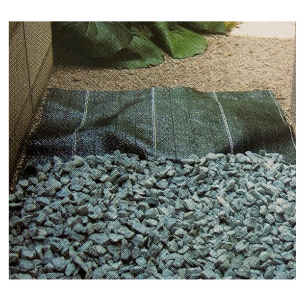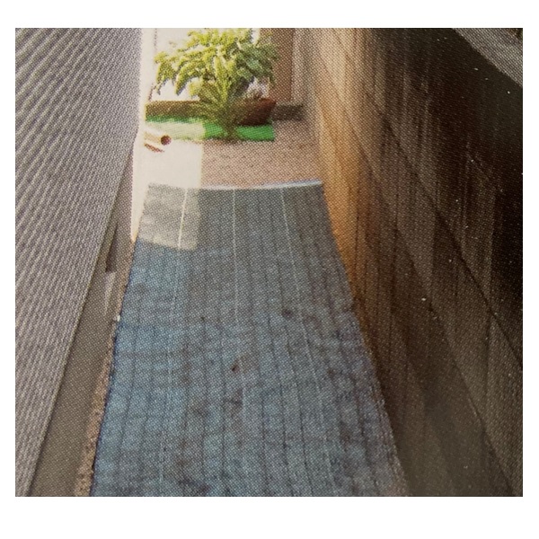 約5cm間隔に特殊繊維を使用して、水抜けを促進させています。遮光性が高く雑草の育成を抑えます。特殊な折り方をしているので表と裏の色が異なっています(裏面は遮光率を高める黒・表面を濃緑です)。約20cm間隔でラインが入っています。