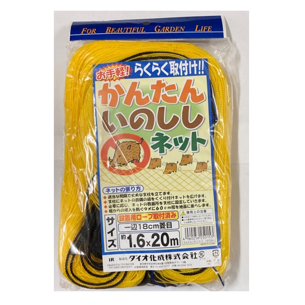 18cm菱目で丈夫、視認性の佳い黄色のネットです。猪や鹿の対策にも使用でき、