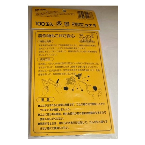 有害鳥獣に向けて威嚇するように撃って下さい。周辺にビー玉が当たる音や、空気を切る音で恐怖感を植え付け、危機感をあおって、有害鳥獣を追い払います。ビー玉100個付。