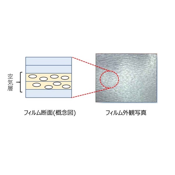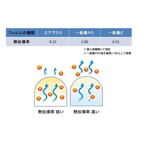 5層構造を活かし内層にエア(気泡)をプラスしたフィルムです。 空気の断熱性により保温性に優れています。 加温ハウスの場合は、暖房燃料消費量の削減が期待できます。