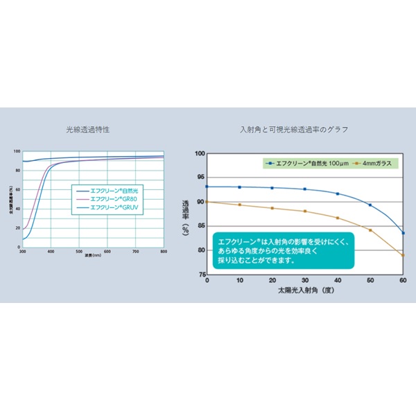 エフクリーンはサンシャインウェザーメーターによる15,000時間の耐候性促進試験でも、ほとんど劣化は見られません。 これは室外での実使用期間では30年以上に相当します。また流滴性能、UVカット機能も長期に渡って持続します。