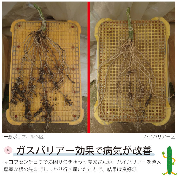 一般的な農ビや農ポリは、分子間の隙間が広くクロルピクリンなどの土壌消毒剤が漏れ出てしまっておりましたが、「ハイバリアー」は