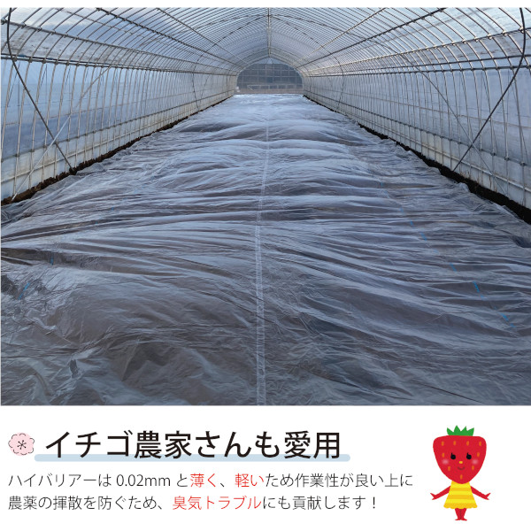 ※ガスバリアー性が非常に高い商品ですので、土壌消毒剤の残留にご注意ください。特にマルチ畝内処理で使用される場合は、土壌消毒剤が土中分解されるまでの十分な期間を取ってください。