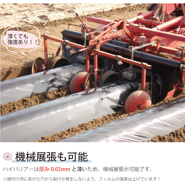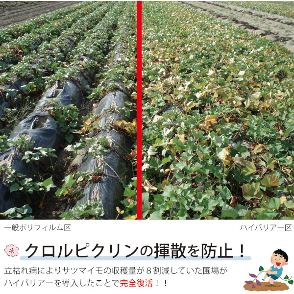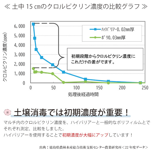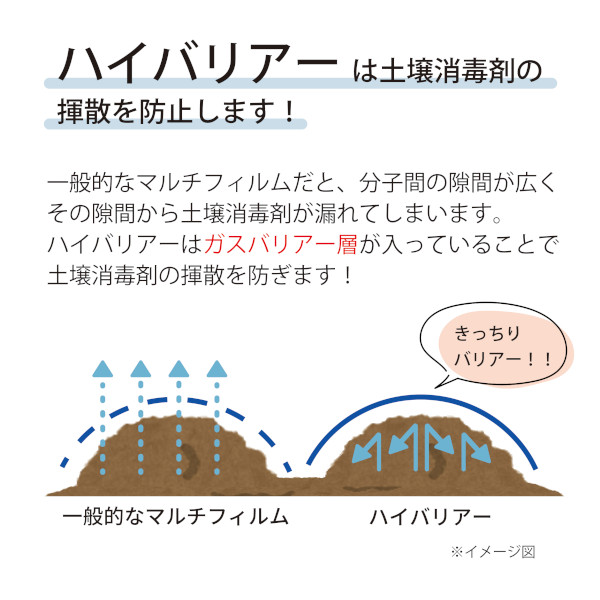 ※ガスバリアー性が非常に高い商品ですので、土壌消毒剤の残留にご注意ください。特にマルチ畝内処理で使用される場合は、土壌消毒剤が土中分解されるまでの十分な期間を取ってください。