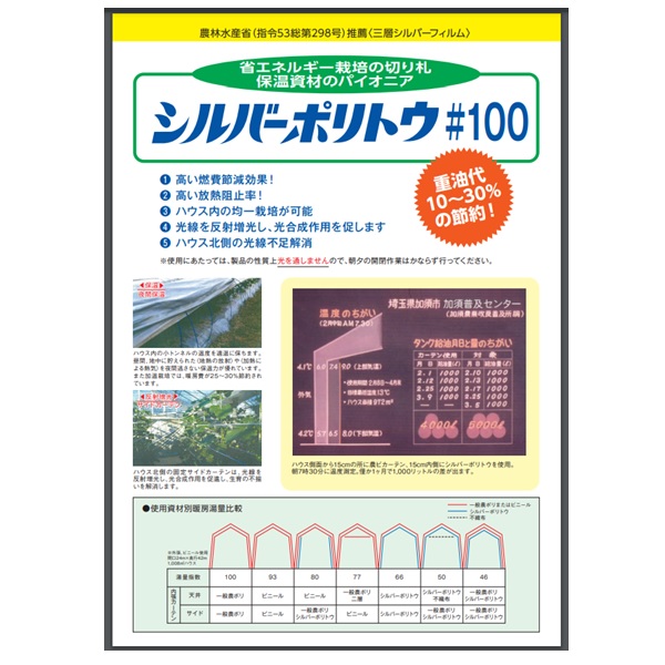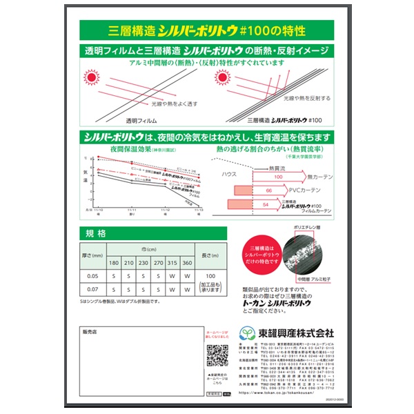 アルミ粒子層をポリエチレン層でサンドウィッチした多層構造で形成された農POフィルムです。
