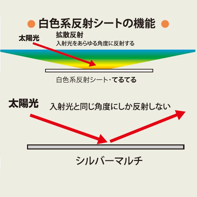 ・白色系反射シートの為、太陽光が、拡散反射し、入射光をあらゆる角度に反射します。