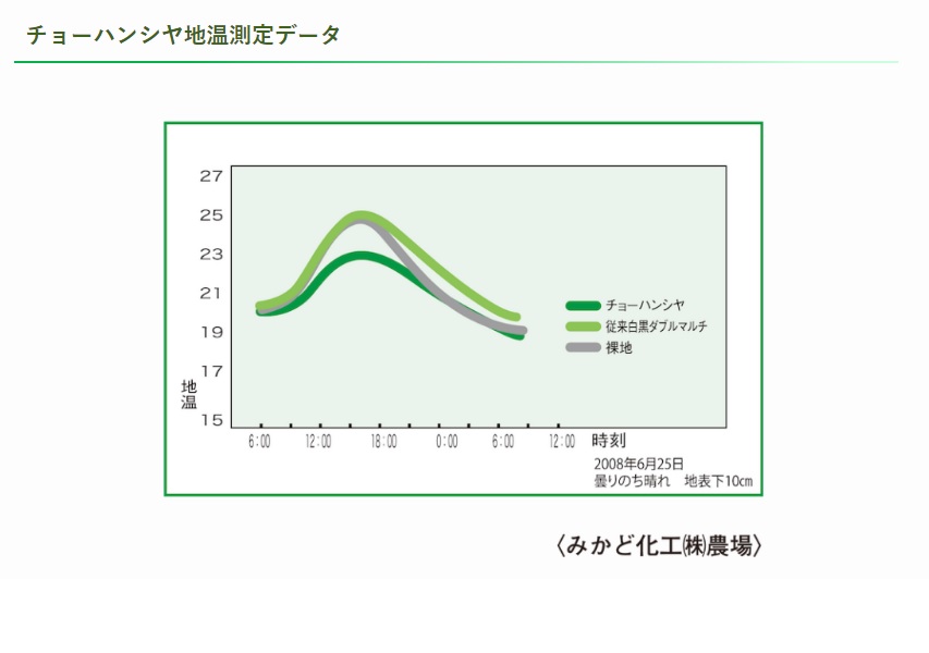 一般的な白黒マルチと比べ、盛夏期の地温(地下7.5cm計測)を約2℃も抑制し、根の高温障害(青枯れ病・根腐れ)を軽減。