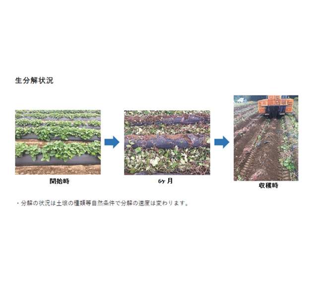 ・生分解マルチは、透湿性があるため干ばつ期などには土壌の乾燥が進みやすい場合がありますので、水分管理には十分ご注意ください。