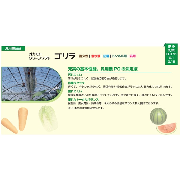 特殊配合により汚れが付きにくく、保温性・無水滴性・防塵性に優れた練り込み型フィルムです。