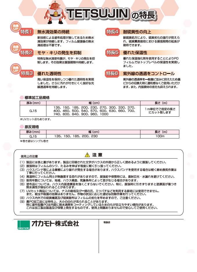 紫外線の透過率を一般農ビ並みに抑えたため農ビからの切換え時に違和感なく