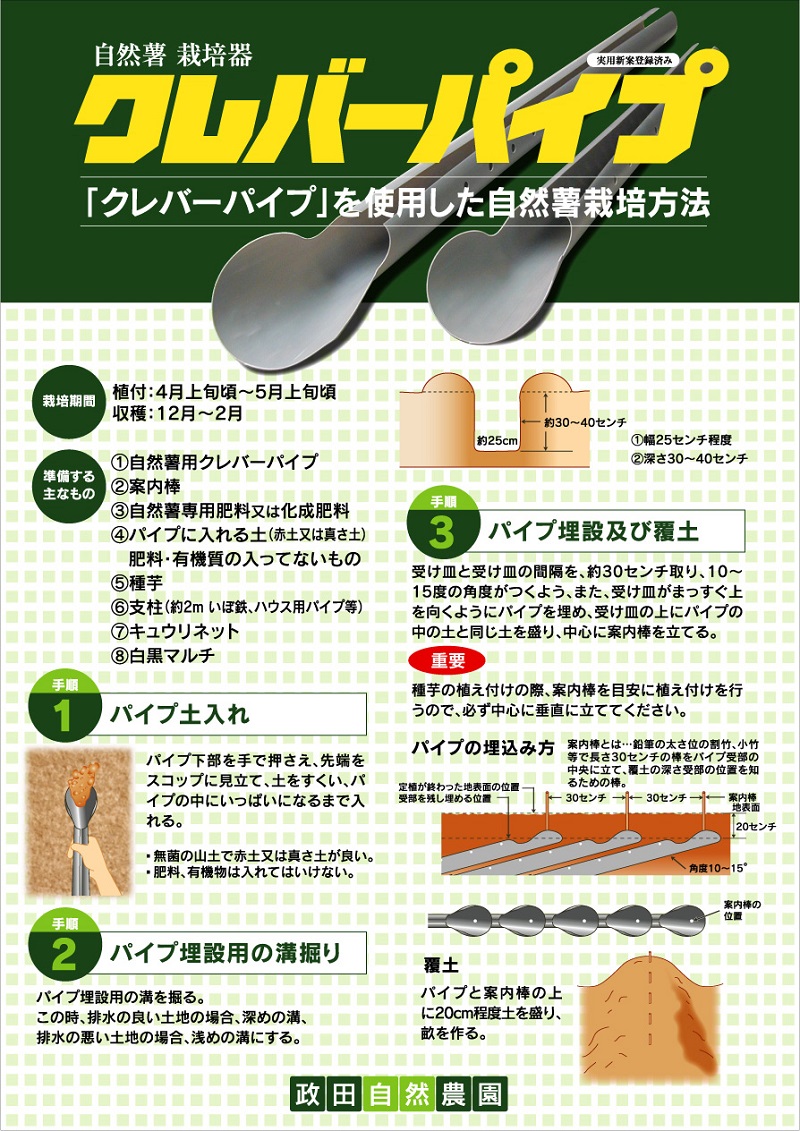 自然薯と長芋を保護育成するパイプです。塩ビ製ですので作業が簡単です。10a当りの使用本数は2500本が目安です。70gの種芋で、1本当り約800g内外の収量が得られます。長芋用の爪(止具)2個付きタイプです。