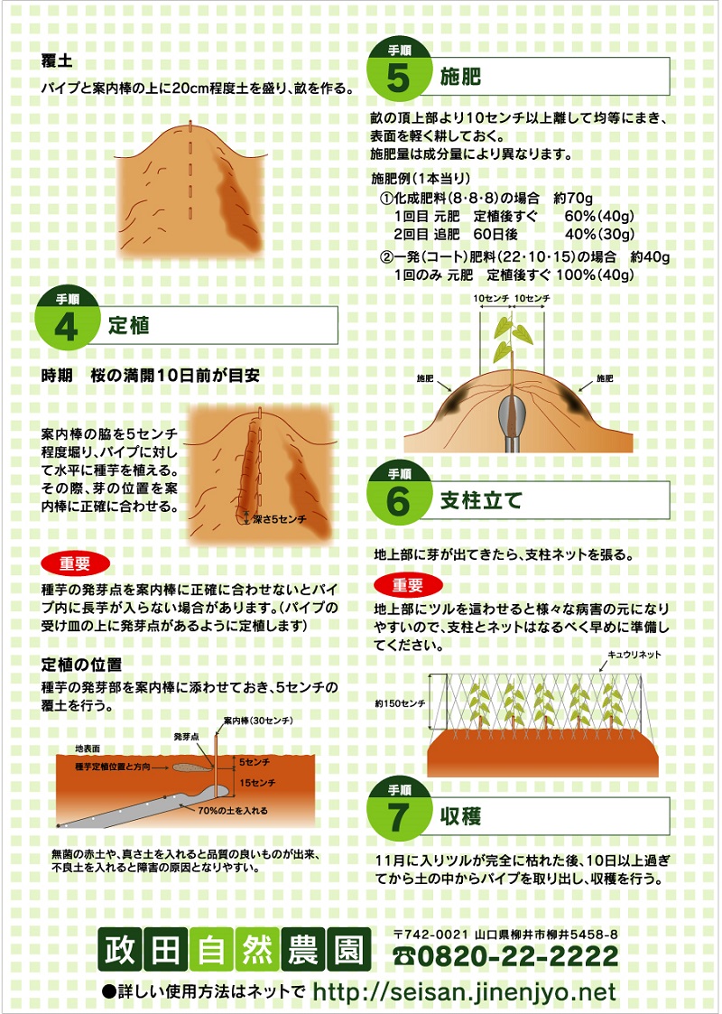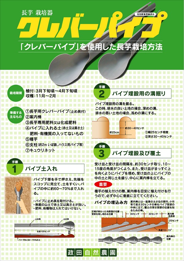 自然薯と長芋を保護育成するパイプです。塩ビ製ですので作業が簡単です。10a当りの使用本数は2500本が目安です。70gの種芋で、1本当り約800g内外の収量が得られます。長芋用の爪(止具)2個付きタイプです。