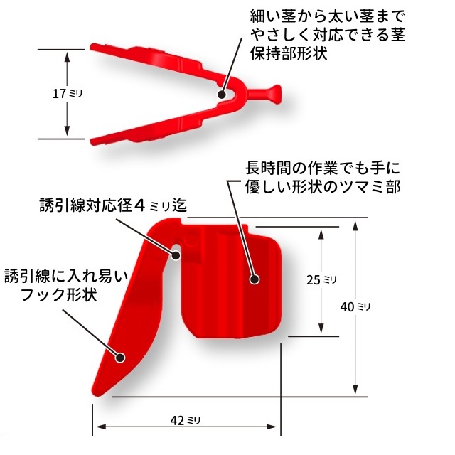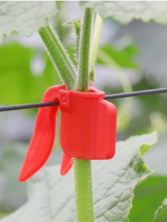ダブルフック式で誘引線に茎を簡単に掛けることができます。