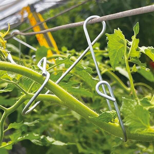 「ラクターン」は、直立Uターン栽培を可能にすることで、斜め誘引やつる下ろしといった従来の負担の大きい作業を不要にし、労力を大幅に削減できる誘引資材です。立木の交差がなくなるため十分な採光が得られ、植物本来の屈地性により根張りが良くなって養分吸収が促進され、草勢が後期まで安定。段数が増えることで増収にもつながります。また、茎にストレスがかからないため果実の玉伸びが良く、収穫後期まで大玉果を安定して得られます。株間を約35cmまで詰められることで坪当たりの株数が増え、密植でも通風・採光性を確保できるため病害虫の発生も抑制。自然な形でUターンが形成されることで茎への負担やボト病のリスクも軽減されます。さらに、耐腐食性に優れた亜鉛めっき鋼線を使用しており、長期使用にも耐える経済的な設計です。