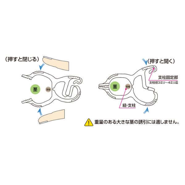 茎保持中はクリップの先端に隙間が出来ないので誘引紐から外れにくくなっています。