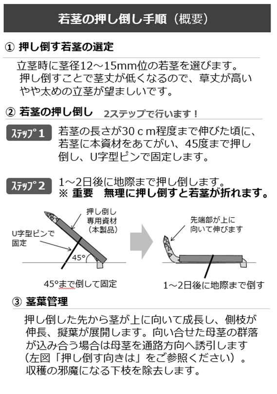 ステップ1 :若茎の長さが30cm程度まで伸びた頃に、若茎に本資材をあてがい、45度まで押し倒し、U字型ピンで固定します。