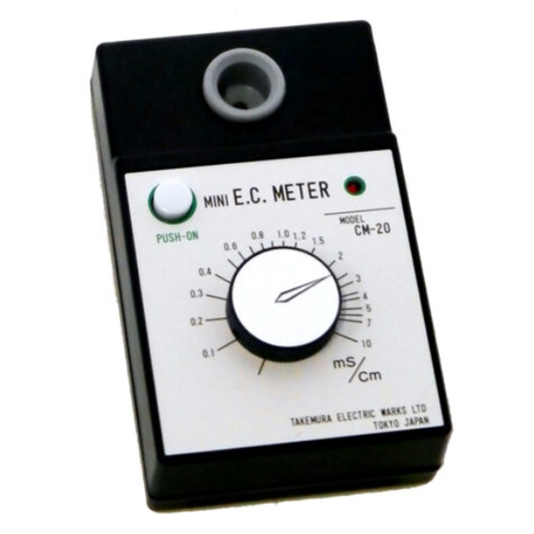 左上の白いボタンを押しながらダイヤルを回し、ランプが点灯した位置が測定値(mS/cm)。