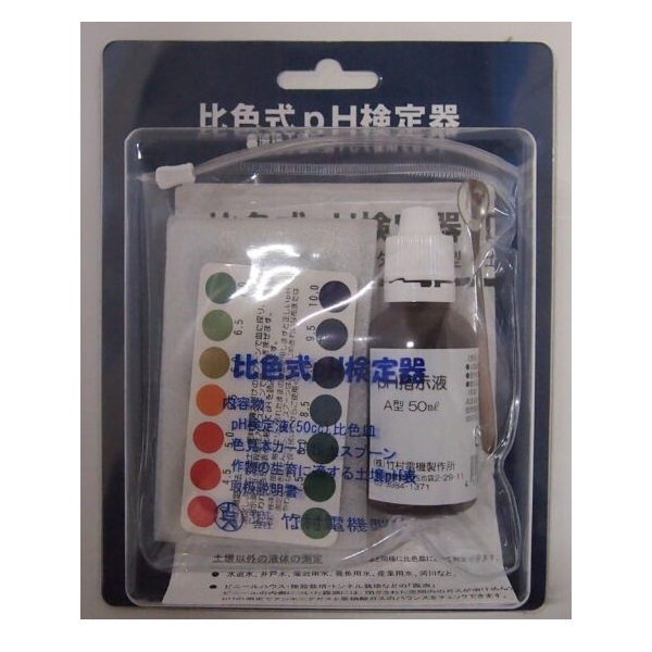 取扱いが極めて簡単なPH測定器です。測定したい土壌などを、スプーンで軽く一杯皿に入れる。PH指示薬を皿の8分目まで入れて軽くかきまぜる。色表と色を比較し、PHを測定します。