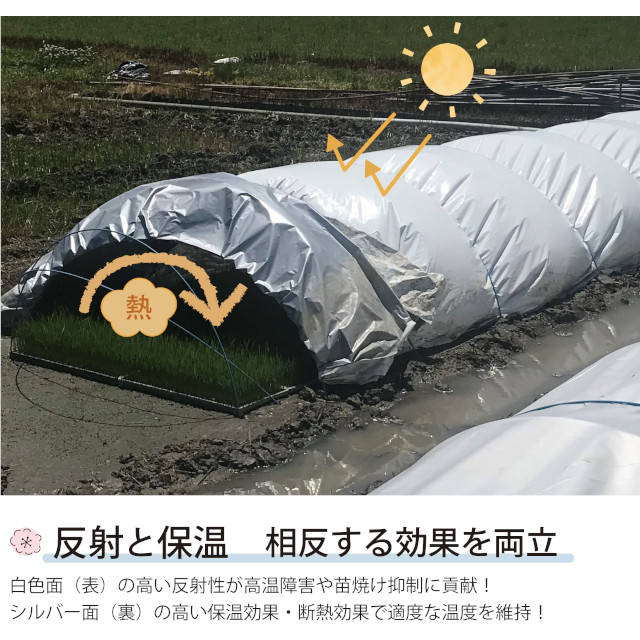 に効果を発揮します。シルバー面(裏)は高い保温効果と断熱効果により、適度な温度を維持します。適度な光線(可視光線透過率10%)を通し、芽出しから緑化まで使用可能です。