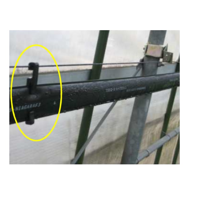 ハウス両サイドに、エスター線(3mm)を展張し吊り下げる固定具です。