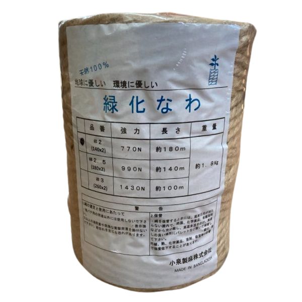 天然の植物繊維(ジュート)100%。藁縄と同じようにバクテリアの作用で腐食します。作業や持ち運びに便利なように、コンパクトにつくってあります。