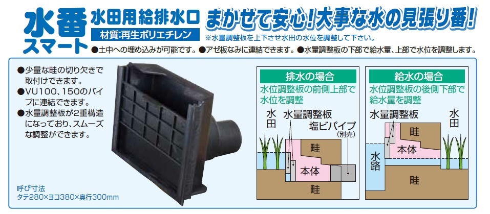 ・水量調整板の下部で給水量、上部で水位を調整します。