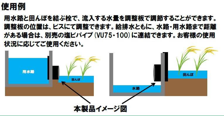 用水路と田んぼを結ぶ栓で、流入する水量を調整板で調節することができます。