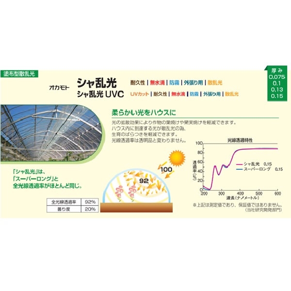 特殊配合により、ハウス内に取り込まれた光線が適度な散乱光となり、ハウス全体に行きわたるため、葉焼け防止に効果的な塗布型フィルムです。