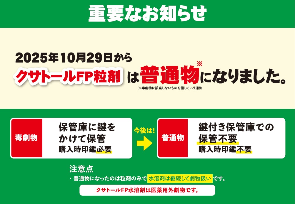 ※2025年10月29日より「クサトールFP粒剤」は劇物指定から除外されることとなりました。