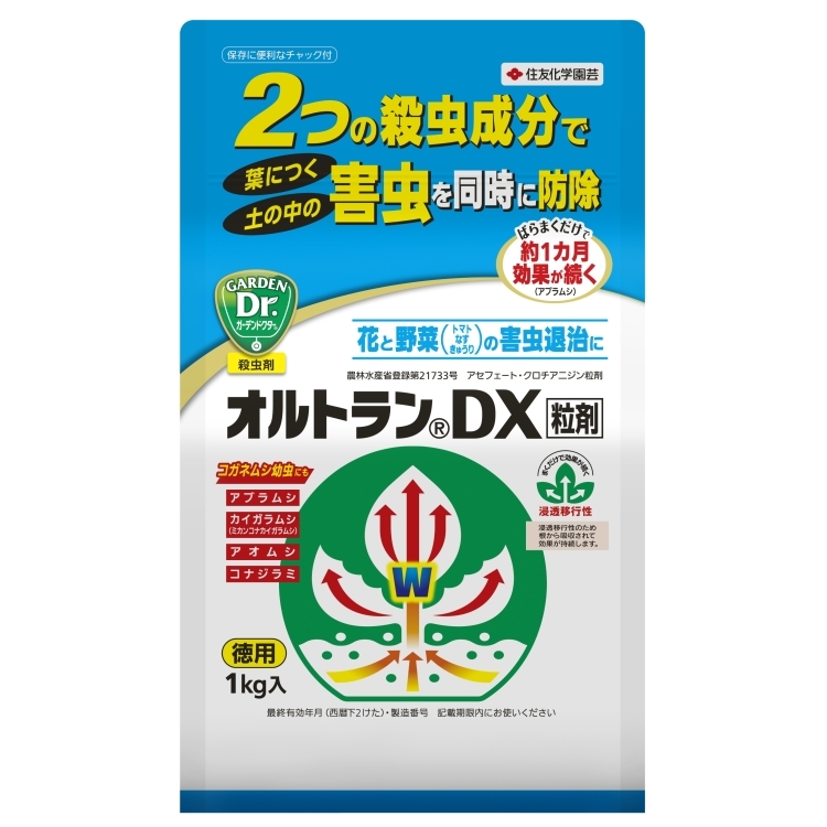土にばらまくだけで植物に吸収され、植物全体を害虫から守る予防的効果※が約1ヵ月(アブラムシ)続きます。 (※殺虫効果の長い残効性を指す)