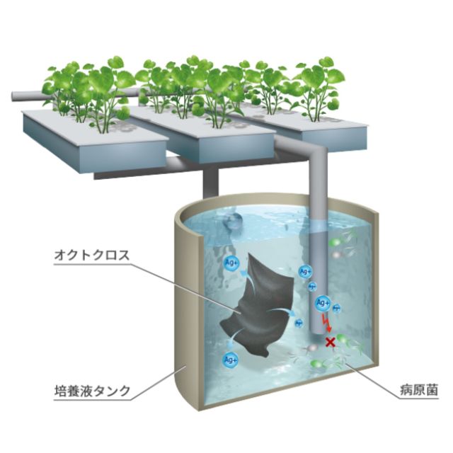 オクトクロスは、銀の微細な粒子をナイロン繊維上に均一にめっきした物で、 水耕栽培(養液栽培)で発生する野菜類の病害を防ぐことができる、国の定めた唯一の防除剤です。