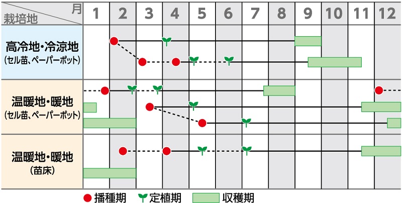 ・秋まき栽培では、早まきすると抽苔が多く発生することがあるので、その地域の適期播種を心がけます。