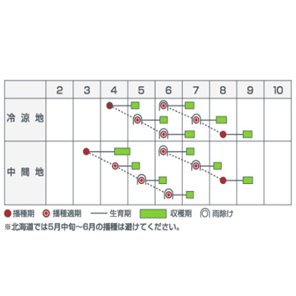 抽苔が遅く、中間地・冷涼地の春~夏まき栽培に適します。