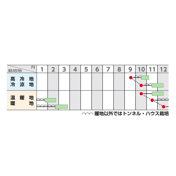 ● 土壌は広くしかも耐湿性が強いため、火山灰土から水田裏作まで幅広く栽培することができます。 耐寒性があり、低温伸長性も優れているので特に低温期には最適の品種です。暖地では無被覆でも十分栽培できますが、温暖地の1~2月出荷では、パンチフィルムなどでの被覆栽培をおすすめします。