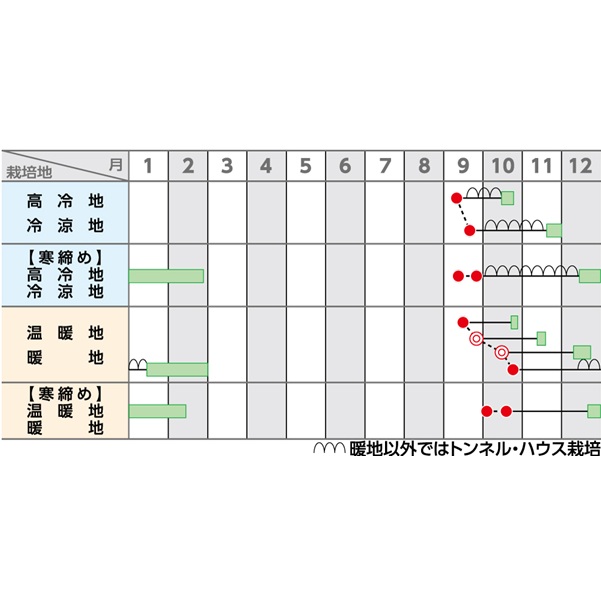 温暖地・暖地は9月中旬~10月中旬まき、高冷地・冷涼地は9月中旬まきが適するします。寒締め栽培の場合、温暖地・暖地は10月上~中旬まき、高冷地・冷涼地は9月中~下旬まきが適します。