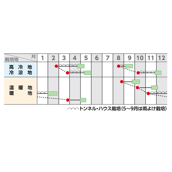 ● 寒冷地の8月中旬~10月上旬まき、2月下旬~3月下旬まき、および温暖地、暖地での8月下旬~3月まきに適する。