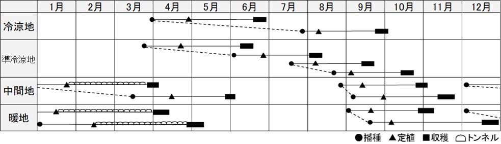 ・高温期での発色が良く、高冷地の夏どり、中間地・暖地の秋どりに適する
