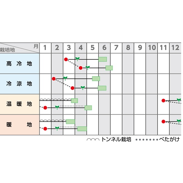 レタスの最適発芽温度は18~20℃です。15~25℃の範囲であれば十分な発芽率が得られると言われています。播種期は低温期にあたりますが、ハウスやトンネル内での育苗をする場合、換気次第で非常に高温になってしまうことがあります。発芽適温を考え、日中や夜間の育苗床の温度管理に注意してください。 レタス全般に言えることですが、いかにしっかりとした苗を育てるかが、定植後の活着のスムーズさを含め、その後の生育に大きく影響を与えます。地上部ばかりが大きくなるような苗ではなく、根部と地上部のバランスがしっかりとれた苗を作るように心がけることが大切です。低温期とはいえ、過保護な管理は、苗の徒長を助長します。定植前には、定植予定圃の温度に十分慣れさせるようにしてください。 またマルチング前の圃場が乾燥しすぎていると、定植後の活着が遅れたり定植後の灌水が不足したために、生育が不ぞろいになることがあります。定植前に、しっかりと圃場に水分をもたせた状態でマルチングをするようにしてください。