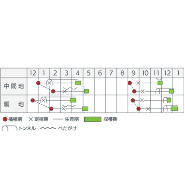 初期の生育速度がゆっくりな品種です。良苗を適期に定植し、順調な生育を心がけます。