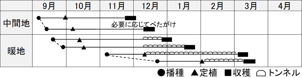 ・厳寒期を除く冬~春どりの広い作型で栽培可能