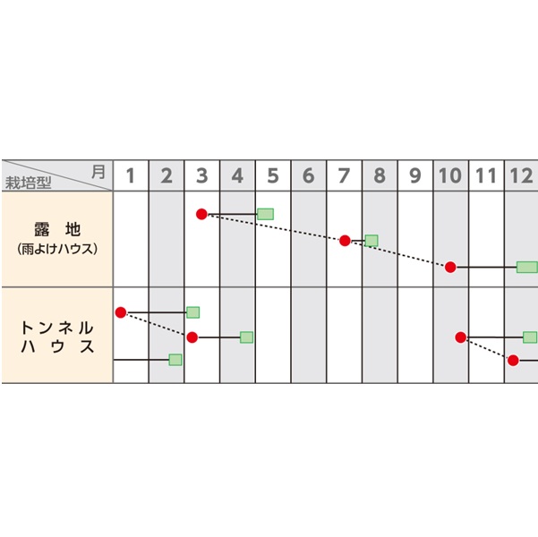 高温期で22~25日、低温期で35~50日くらいで収穫できます。早生種のため高温期栽培では収穫の幅が狭く、収穫遅れになりがちなので、収穫労力に合わせた播種面積を計画します。春~初秋時での出荷は予冷庫(10~15℃)を利用して鮮度を保持します。