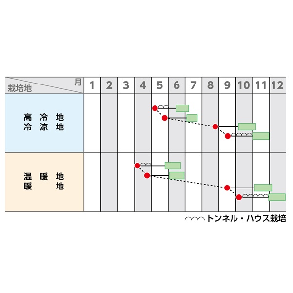 直播、移植栽培どちらも可能です。低温期の抽だい防止では移植栽培が適します。