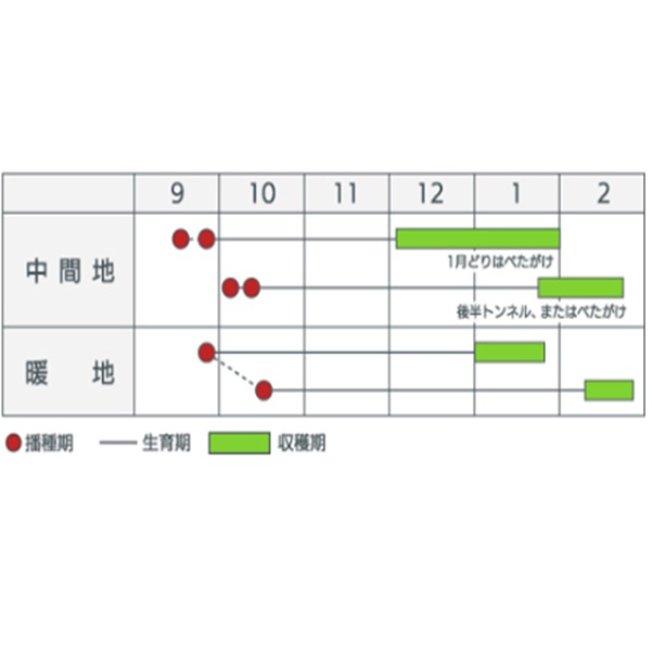 ●作型は、暖地と中間地の9月末?10月上中旬まき、12月末?2月どり栽培に適しています。